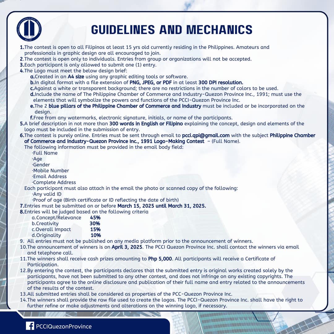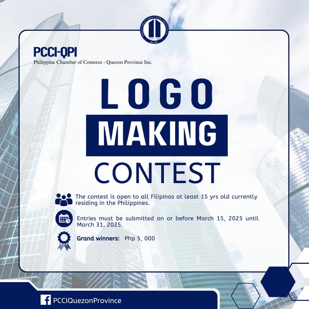 6. The contest is purely online. Entries must be sent through email to pcci.qpi@gmail.com with the subject Philippine Chamber of Commerce and Industry- Quezon Province Inc., 1991 Logo Making Contest (Full Name).